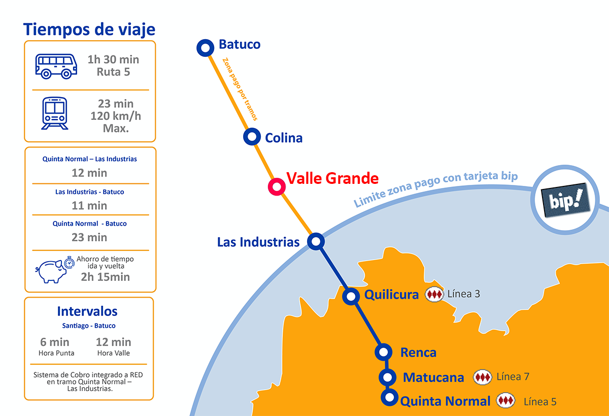 El Metro Tren Santiago-Batuco, que considera una inversión de 650 millones de dólares, contará con dos nuevas vías férreas de trenes para pasajeros (con conexiones a las líneas 5, 7 y 3 del Metro), y una tercera exclusiva para carga.