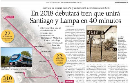 Una inversión cercana a los US$ 310 millones contempla el poner en marca este tren de cercanía que unirá Santiago con la comuna de Lampa,